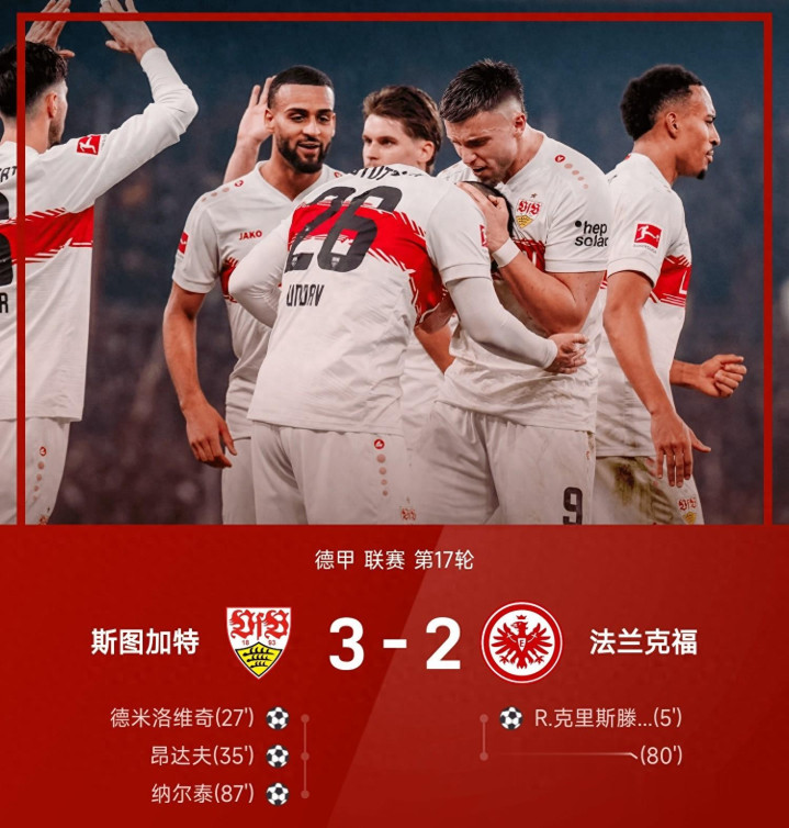凤凰彩票 德甲! 3-2克里斯滕森闪击, 纳尔泰绝杀! 斯图加特完胜法兰克福!