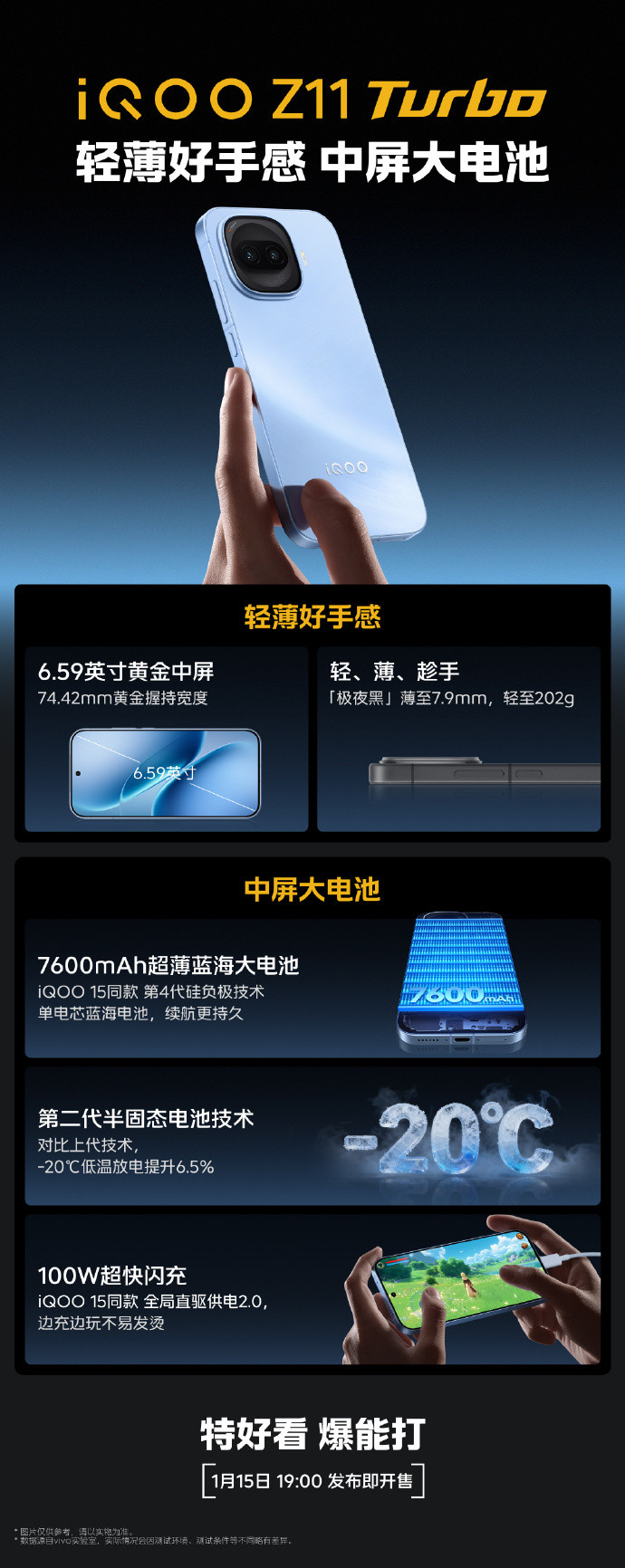 iQOO于2026年1月15日发布Z11 Turbo,定位“战斗精灵”,主打性能与颜值。搭载骁龙8 Gen5与自研独显芯片Q2双芯,安兔兔跑分达359万;配备6.59英寸1.5K OLED直屏,支持144Hz刷新率和4320Hz PWM调光。后置首发2亿像素主摄,支持OIS及4X无损变焦。内置7600mAh蓝海电池,凤凰彩票app支持100W快充,厚7.9mm、重202g,并首次在Z系列加入IP68/IP69防护与超声波屏下指纹。提供四款配色,售价约2500–3000元,剑指中端性能旗舰。