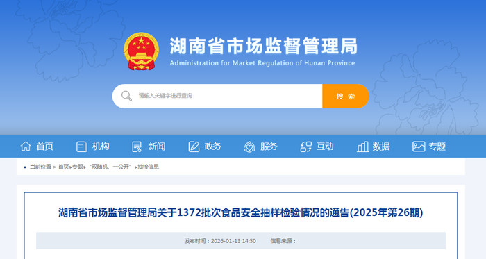 凤凰彩票官网app 湖南省市场监督管理局关于1372批次食品安全抽样检验情况的通告(2025年第26期)
