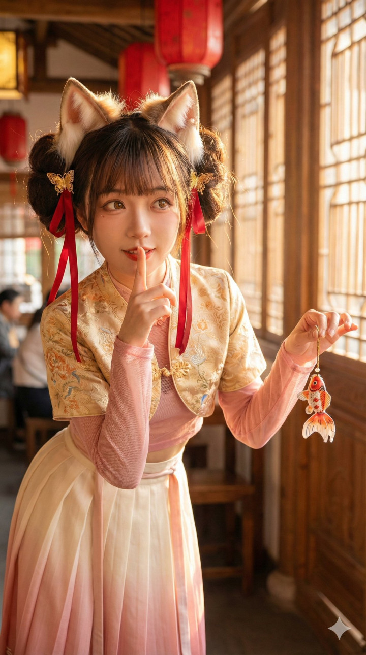 动作:左手"嘘~"手势 + 右手持锦鲤挂件