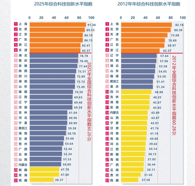 另据中国科学技术发展战略研究院发布的《中国区域科技创新评价报告2025》(下称“报告”),上海得分为91.38,居全国之首,同比提高2.18分。