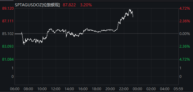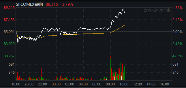 具体来看,现货黄金盘中一度涨至4634.58美元/盎司,现货白银更是大涨超4%,一度突破89美元/盎司关口。此外,COMEX白银盘中亦创新高,最高至89.215美元/盎司。