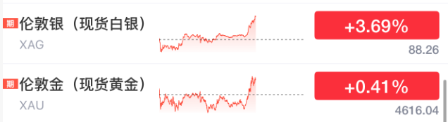 黄金白银的价格则持续拉涨,现货白银首次站上88美元/盎司,今年迄今累涨超23%。