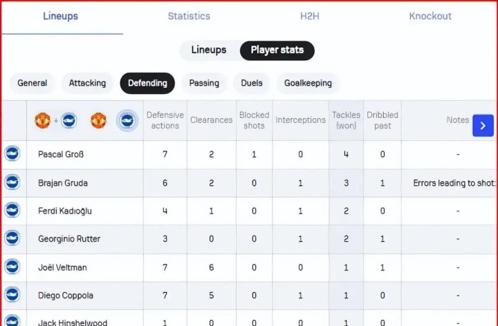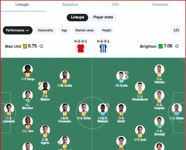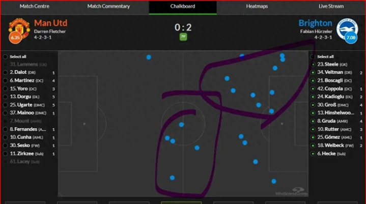 从比赛情况看,弗莱彻的战术主要是地面进攻,边后卫带球给对手制造宽度,但是这个战术并没有解决后场出球的问题。这次曼联与布莱顿的比赛里,中场的布局采用了五中场,乌加特是后腰,梅努是中场组织者。但是这种中场的配置并没有能够推动进攻,从比赛里达洛特频繁的参与进攻可以看出,他在进攻区域的压上,但是他的能力有限,使得曼联的战术难以推进,达洛特的跑位虽然到位,但是传球和处理球的环节的效率不高,无法带动球队的进攻,正因为如此,曼联在比赛中大部分时间都是依靠球员个人的突破来寻找机会,但是突破的成功率一直不高,全场15次突破尝试,只有6次成功,球队陷入无法组织进攻的困境。