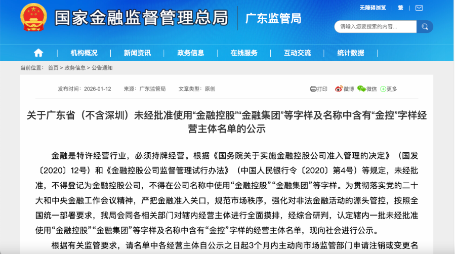 2026年1月12日,广东金融监管局公示了辖内(不含深圳)61家未经批准使用“金融控股”“金融集团”等字样及名称中含有“金控”字样的经营主体,要求其3个月内申请注销或变更名称、业务范围。