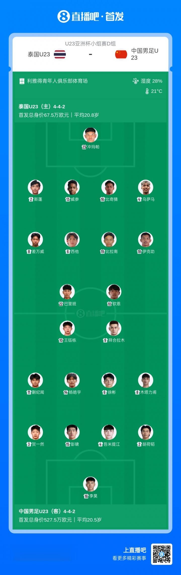 你的位置:凤凰彩票(welcome)APP下载 > 时时彩 > 凤凰彩票app下载 是对手近8倍! U23国足vs泰国首发身价对比: 527.5万PK67.5万