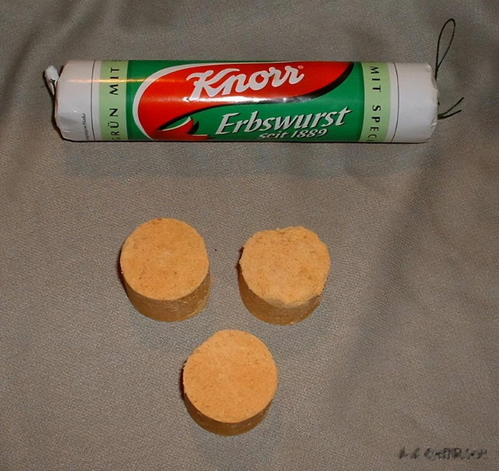 豆粉香肠(Erbswurst),基本上它是一种把奶油豌豆汤浓缩之后包成像是香肠样子的东西。