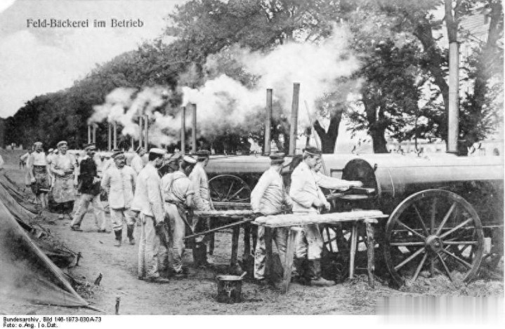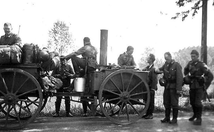 在二战作战期间,德军士兵每天可从其连队或营级的野战厨房获得一次热食。理想情况下,当士兵完成任务准备前往下一个任务地点前,该单位的伙房人员(包括炊事士官(Feldkochunteroffizier)及其领下的伙房助手(Küchenbullen))会提前在伙房马车后的拖车(Gulaschkanone)上生火,以便在寒冷天气中提前供应茶或咖啡的热水——这种情况在冷天尤为常见。