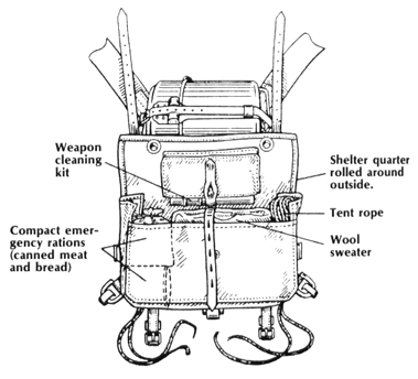 通常,士兵会配给当日的面包口粮(Kriegsbrot,一种深色杂粮面包),并领取奶酪(Käse)、果酱或蜜饯(marmalade),有时还会获得硬香肠(Dauerwurst)作为早餐。伙房拖车(Gulaschkanone)中的热炭会全天保持燃烧,用于烹制炖菜(Eintopf)作为午餐,这通常是当天最丰盛的一餐。晚餐则与早餐类似,食用早餐配给剩余的面包,有时会额外搭配速食汤(Wehrmachts-Suppekonserve)。